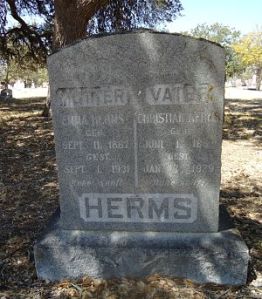 Boerne Cemetery (Boerne, Kendall County, Texas). Christian and Emma Adam Herms marker; personally read, 2011.
