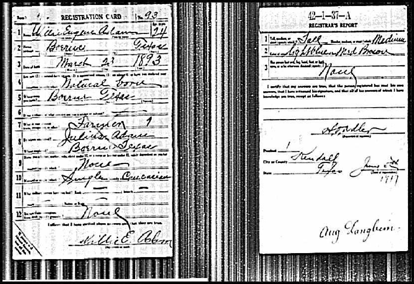 Willie Eugene Adam; age 24; Boerne, Texas; Born March 23, 1893; natural-born citizen; place Boerne, Texas; Farmer; next of kin, Julius Adam, Boerne, TX; no children; single; caucasian; signed Willie E. Adam; Tall; Medium build; light blue eyes; Med. Brown Hair; H. O. Adler; Precinct #1, Kendall Co, Texas, June 5, 1917; Aug. Langbein