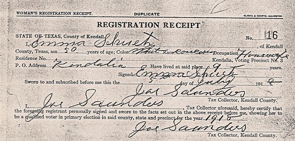 “Emma Schuetz” Kendall County Texas Voter Registration Receipt. No. 16, 5 July 1918.