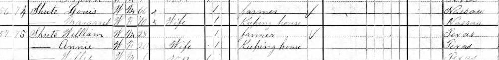 25 March 1876, Wilhelm married Anna Kraft who was born 18 September 1859. In 1880 they are living next door to Ludwig and Marie probably, on the same property. Their name on the census was spelled Shute and they lived in Precinct 4 in Blanco County.