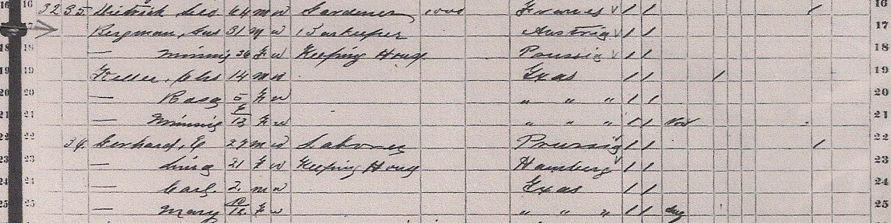 - In the 1870 Bexar County Census, Gus Bergmann age 31 from Austria is listed in the household of Dietrich, Leo age 64 from France, Minnie Bergmann age 36 from Prussia is keeping house and there are 3 children listed Chs Keller age 14, Rosa age 5, Minnie age 6 months born in November