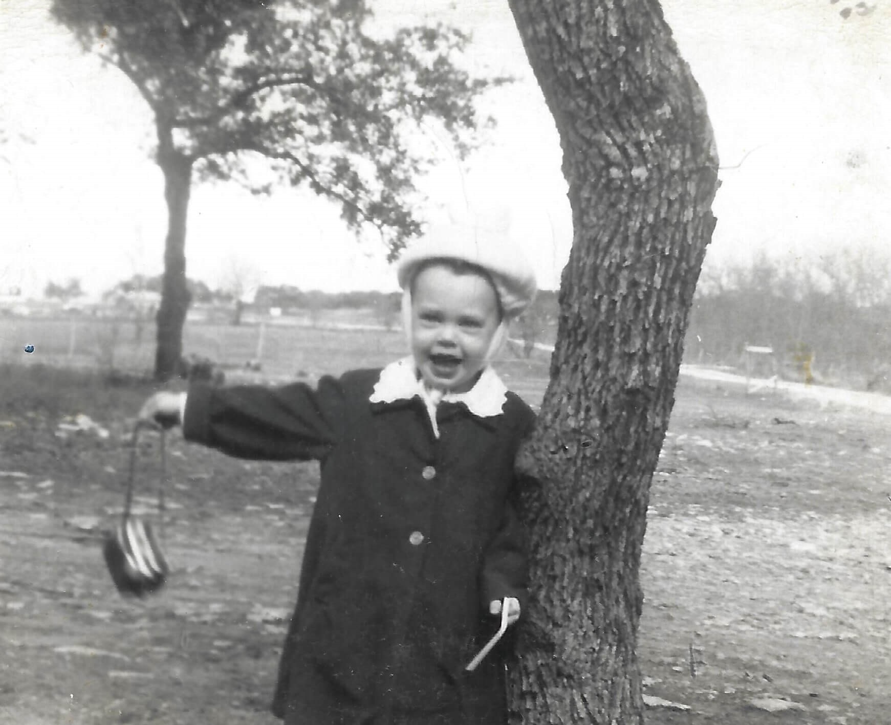 I’m not sure how old I am in this photo, but I can tell you several things about it. I still like purses, the two trees you see are still there, the road directly behind me is now gravel, my mother always had a hat on my head because it took a long time for my hair to grow, the hat is pink, it must be cedar season because my eyes are puffy. This photo was probably taken on Sunday after church. I know the hat was pink corduroy because my mother kept it for a long time. Either she made it, or my maternal grandmother did. I’m sure my grandmother sewed the coat I am wearing. She had five grandkids and she sewed outfits for us quite often. She love to sew.