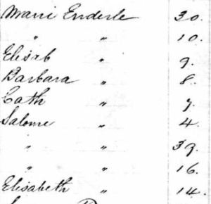 Michel Enderle was born to Johann Georg and Elizabethe Enderle on 11 March 1808 in Baden. He arrived in the United States with his wife and family in January 1847. They sailed on the ship Talbot and landed in New Orleans. Michel married his wife, Anna Maria Manshardt, on 7 November 1833 in Linx, Hohenbuhn, Baden, Prussia, now Linx, Kehl, Baden, Deutschland. In 1850 Michel and his family lived on the East Side of the San Antonio River in Bexar County. They eventually move to Kendall County.