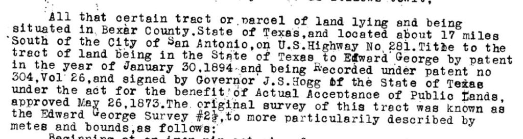 In 1882, Edward George applied to receive a pre-emption land patent for 160 acres in Bexar County, stating he “settled upon vacant public domain” land in accordance with the Homestead Donation Act approved by the State of Texas in 1870.  In 1894, two citizens, B. D. Shield and J. P. Payton, stated in a swore Proof of Occupancy affidavit that Edward George lived on this land.