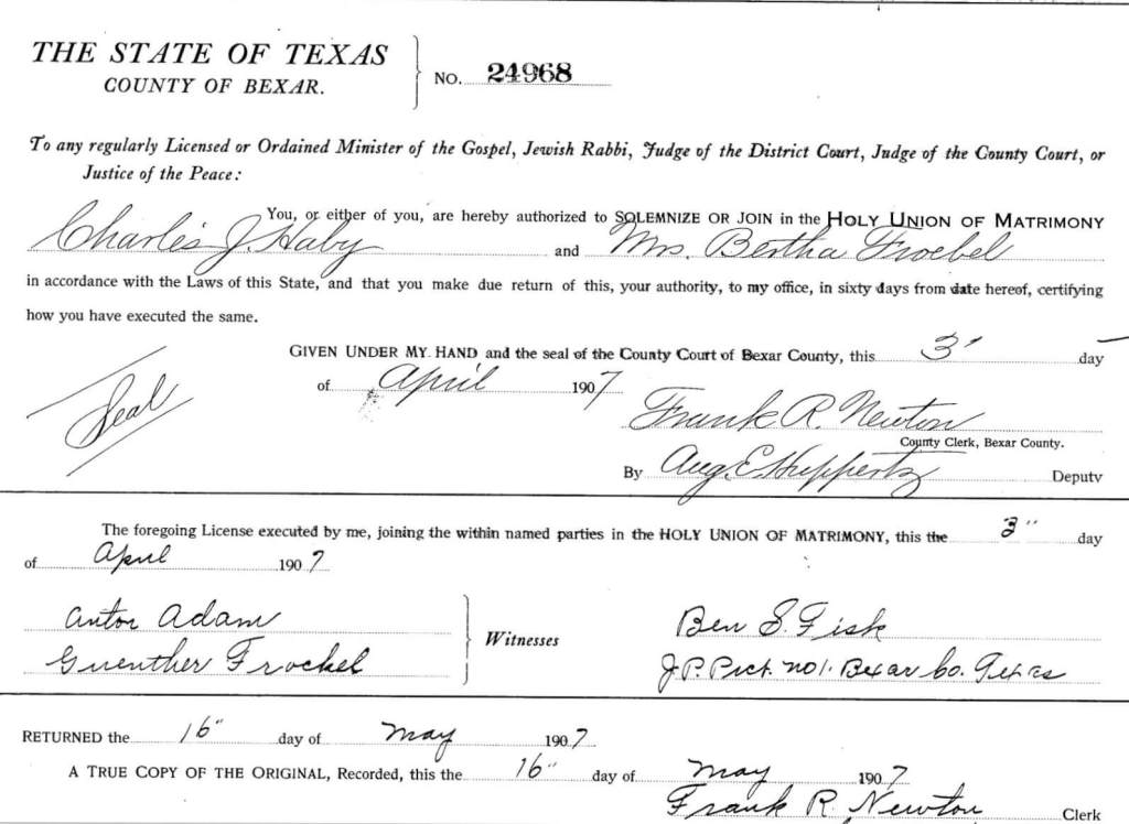 Bertha Adam Froebel is the fifth child of Conrad and Adalbetha Adam. Her husband, Hilmar Gunther Froebel, died in 1905. Two years later, on 3 April 1907, Bertha married Charles J. Haby in San Antonio. Witnesses for the marriage are Anton Adam (not related, as far as I know) and Guenther Froebel.